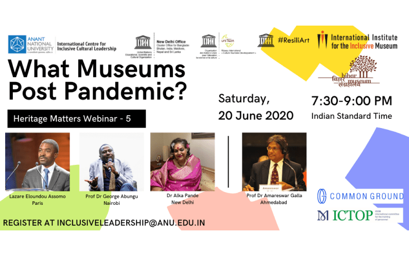 On June 20, ICICL conducted its 5th webinar on ‘What Museums Post Pandemic?’ The webinar aimed at bringing forth the concerns over museum institutions across the world. It raised several alarming questions while acknowledging the social, economic and environmental realities with respective contexts in mind. The webinar was hosted by Professor Dr Amareswar Galla and presided over by the following panellists; Lazare Eloundou, Dr George Abungu, and Dr Alka Pande.