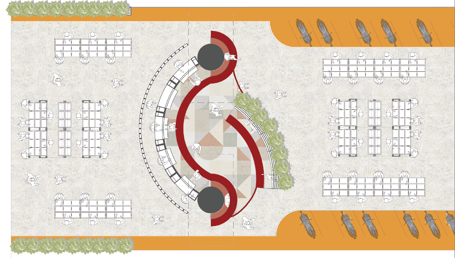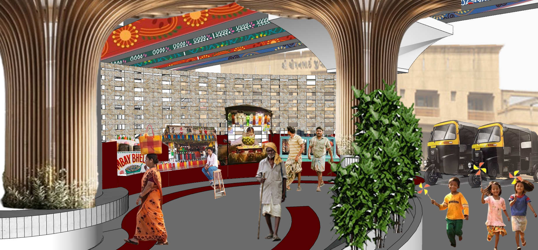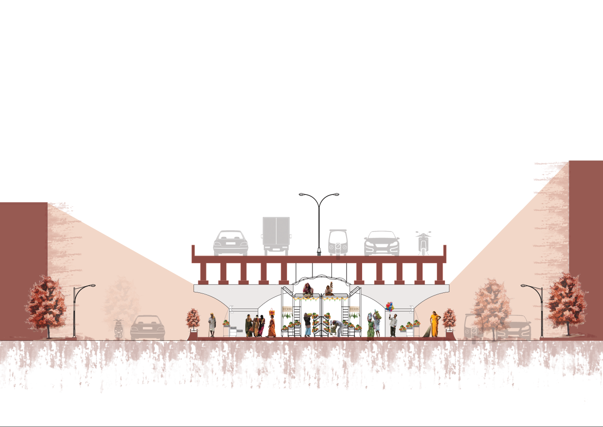 This capstone explores the potential of unused urban areas, particularly the area under the Jamalpur flyover in Ahmedabad. For vegetable vendors, the project’s primary stakeholders, the objective is to transform this underutilised space into a vibrant and dignified marketplace. The idea of the Urban Underbelly, which describes often overlooked but busy areas, is crucial to the design. This project aims to balance the support of formal infrastructure and the informal character of street markets. Integrating official and informal components creates a shared public area that enhances people’s quality of life while respecting their daily requirements. The proposal eventually intends to honour street vendors and acknowledge their contribution to the city by giving them a well-thought-out, functional and welcoming area beneath the flyover.