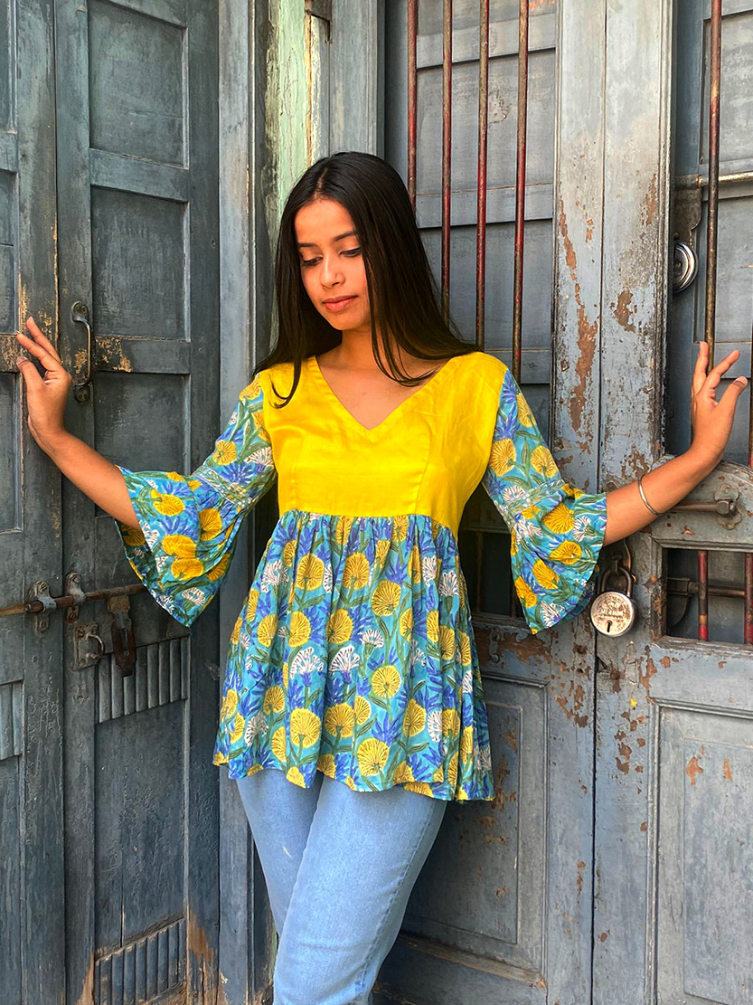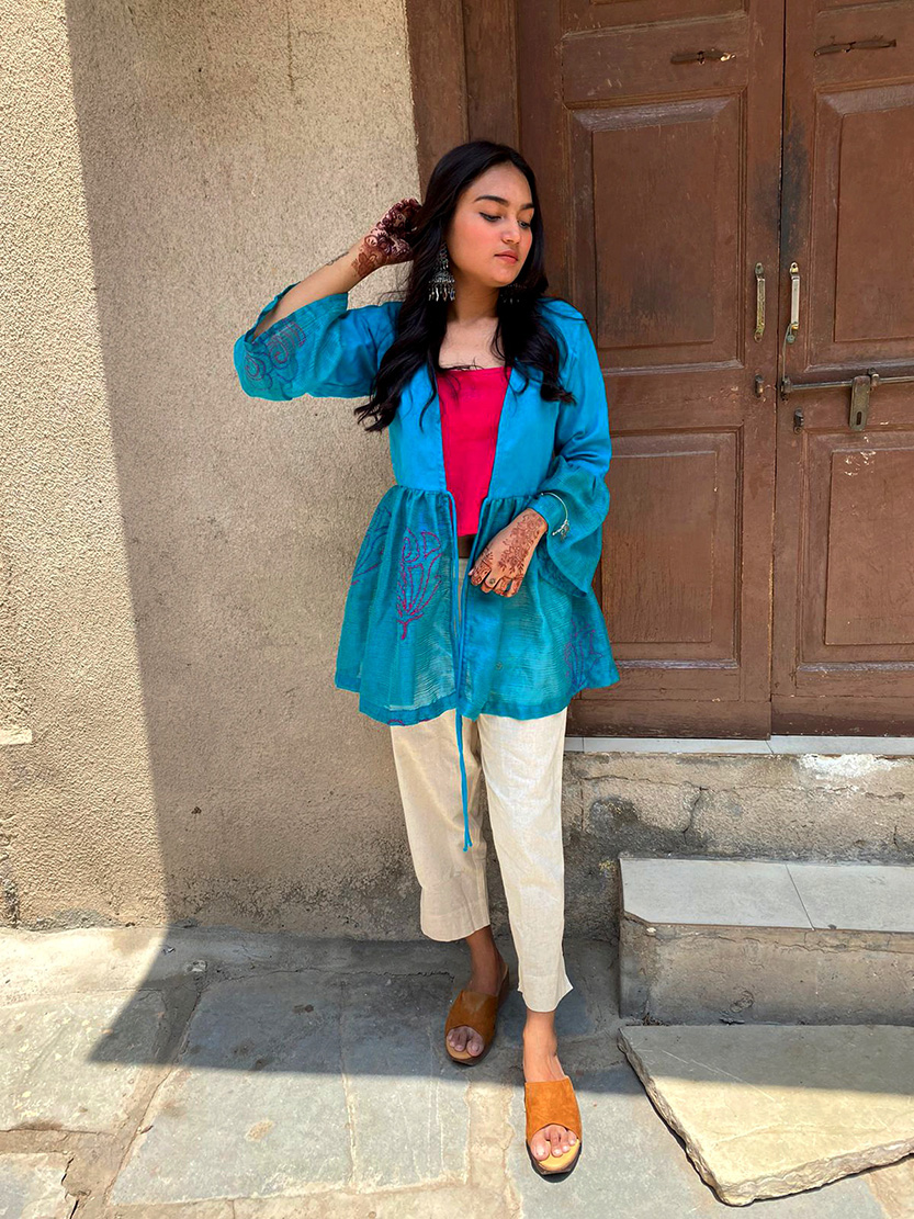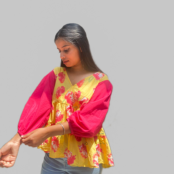 India Recylces wanted to create a mini-collection for women’s tops with a strong focus on upcycling and sustainability. Under the mentorship of Prof Bhaviya Rana, Associate Professor, School of Design and sponsored by India Recylces, Yashika created REVIBE, a collection that blended eco-friendly practices with handcrafted details, giving new life to old fabrics in a unique and thoughtful way.